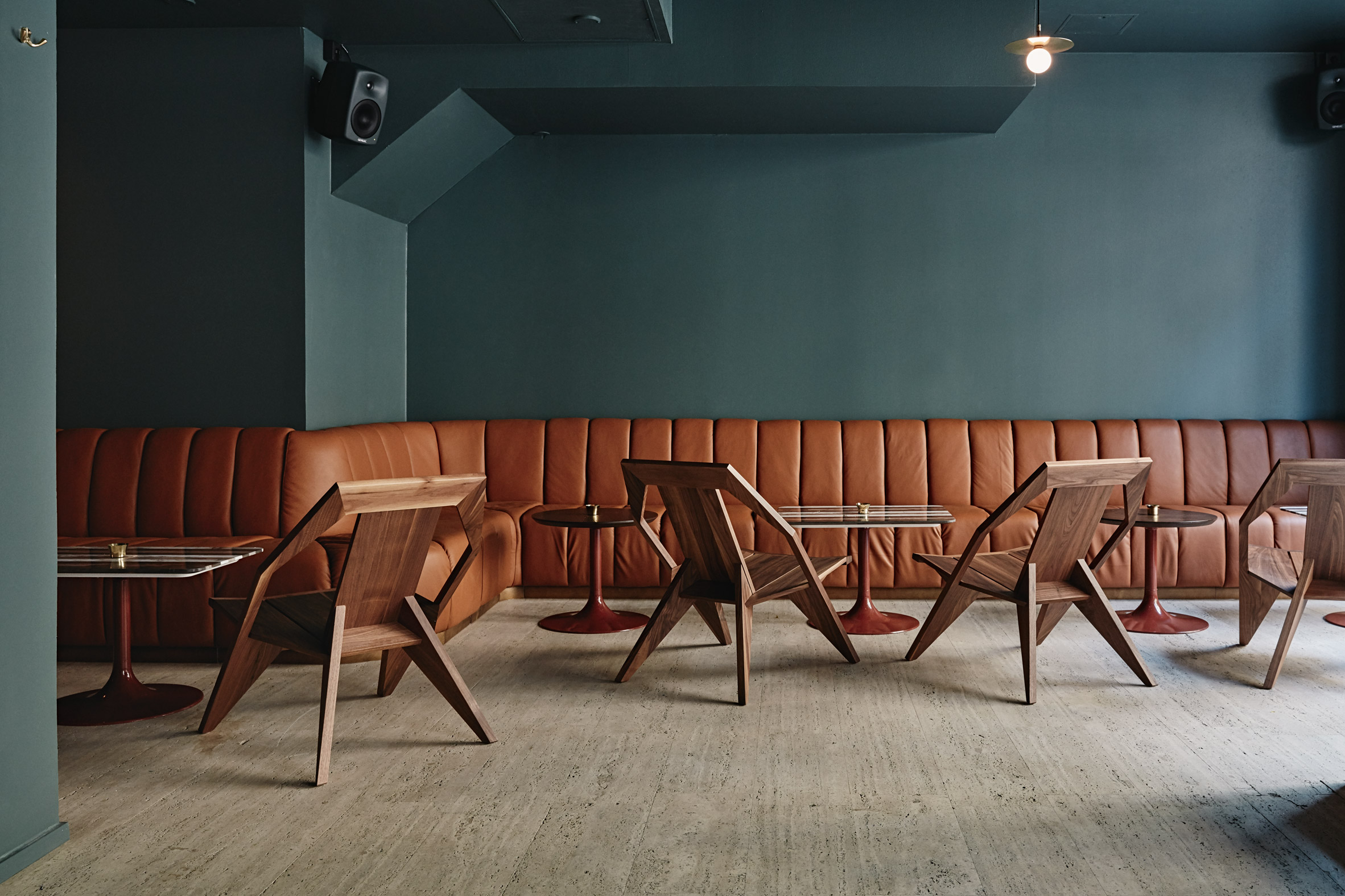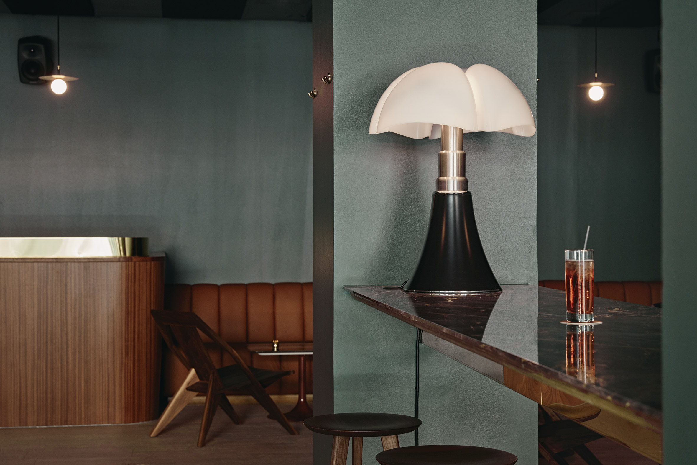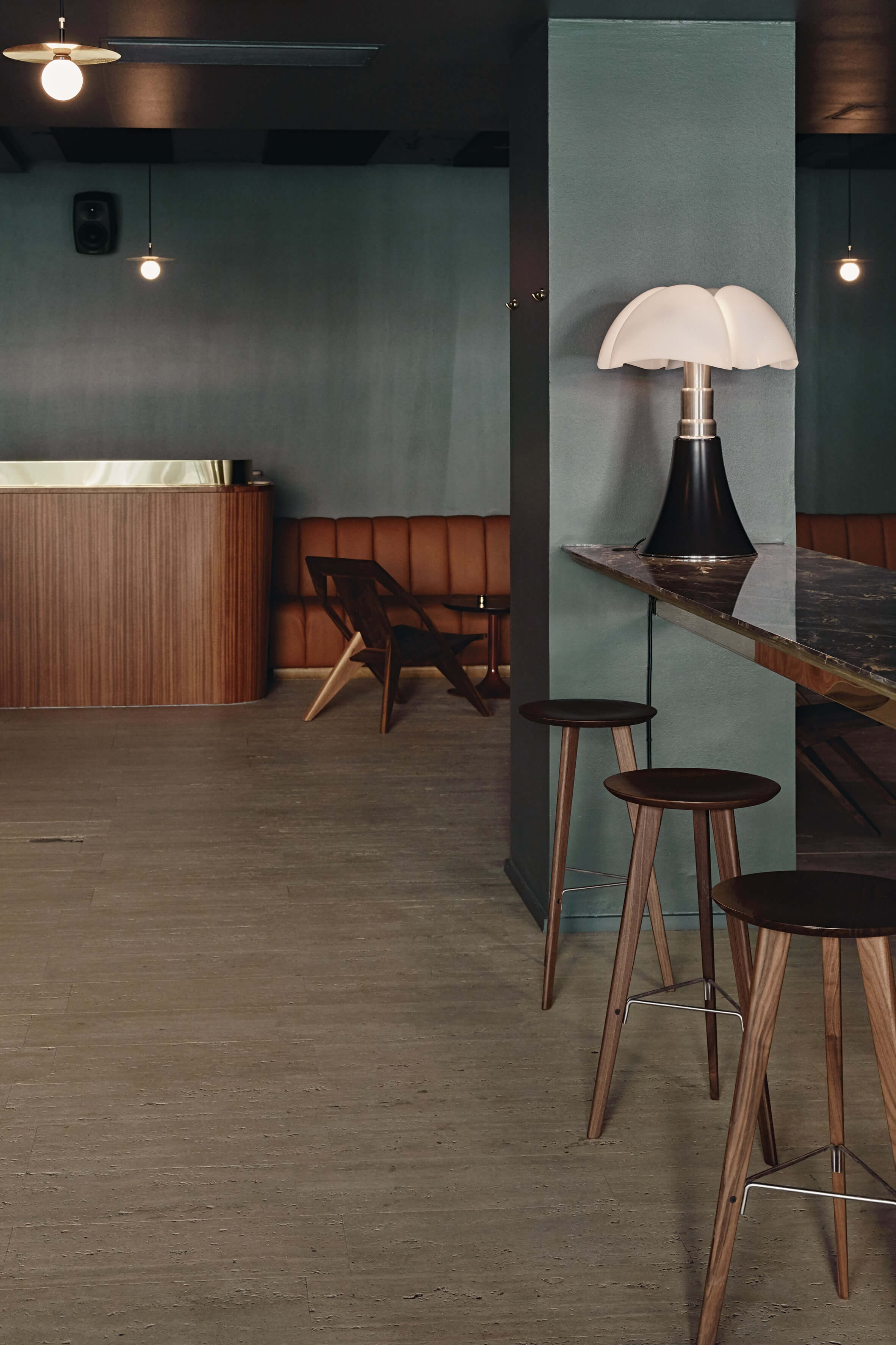 她说:“深绿色的墙壁和天花板用长棕色皮革沙发把你带走,也许到70年代的米兰酒吧。”意大利盖伊奥兰蒂在1965设计的Piopelro台灯强化了这种幻觉。 “现场直播DJ在酒吧的氛围中发挥了很大的作用,并特别关注DJ展位,”Laajisto继续说道。“它是用索菲莱木做的。”